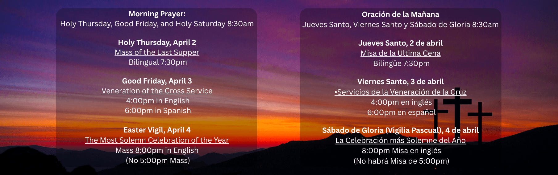 Daily in the Chapel of the Blessed Sacrament. Contact the Parish Office for After Hours.