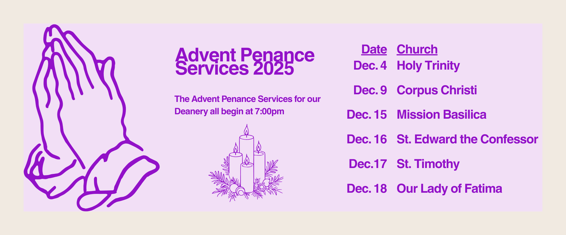 Diariamente en la Capilla del Santísimo Sacramento. Contacte a la Oficina Parroquial para después del horario.
